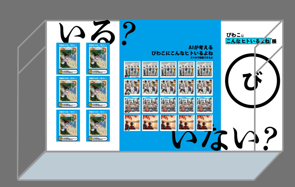 | 展示内容 ①パネル展示 | 「びわこ×ヒト」をテーマに『こんなヒトいる!?いない?』と、 来場者が思わずツッコミたくなるユーモアのあるイラストを長浜のZ世代のクリエイターが手掛けます! パネル展示イメージ▼ ・イラストパネル展示(6点)琵琶湖の水を持って帰るヒト ・AIで生成!パネル展示(20点)釣りおじさん |